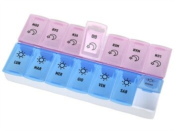 PORTAPILLOLE 7 GIORNI X 2 - IT2 colori trasparenti.Dimensioni 18,3 x 9,3 x 3,3 cm2 scomparti pillole per ciascun giorno della settimana (mattina e pomeriggio) con codici colore.